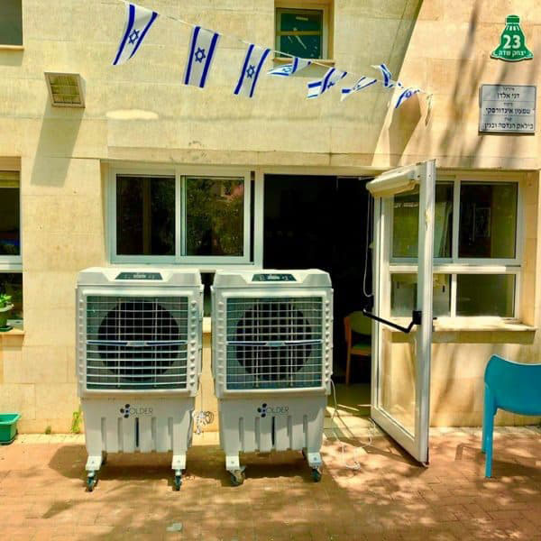 במרכז יום לקשיש בהוד השרון, דואגים גם לקשישים בימים החמים. 2 קולדרים דגם Colder 8000 המשופר הצורה החדשה 2019, באיזורי הישיבה החיצוניים.